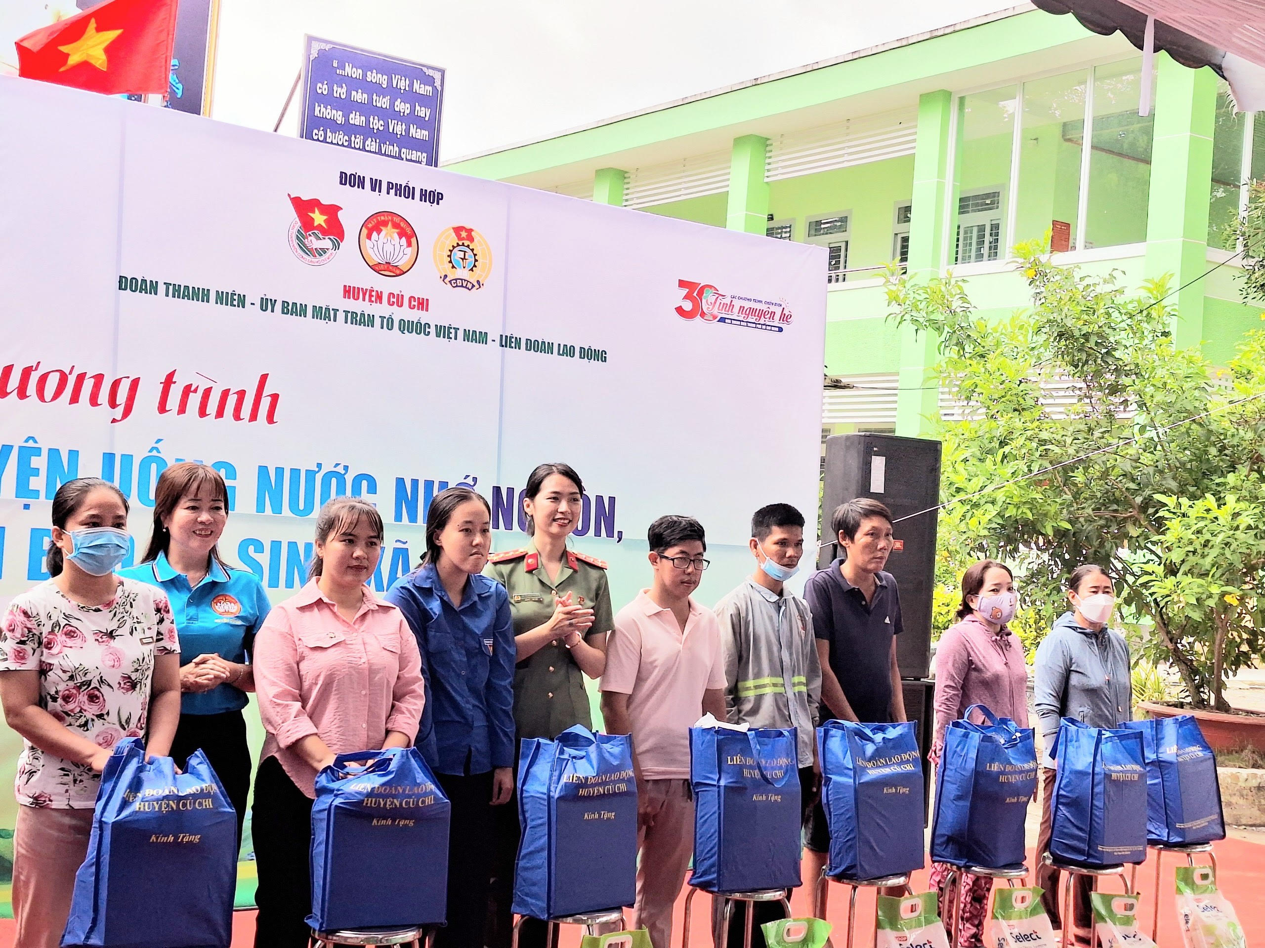 Tại chương trình đoàn Thanh niên Công an TPHCM phối hợp Đoàn Tổng công ty điện lực TPHCM hỗ trợ thực hiện Công trình thanh niên thắp sáng tuyến đường nông thôn trị giá 20.000.000 đồng tại khu vực nhà Mẹ Việt Nam Anh hùng Nguyễn Thị Bún trên địa bàn xã An Nhơn Tây; Đoàn Tổng công ty Cấp nước Sài Gòn trao tặng 2 bồn rửa tay bánh xe mở nước bằng van chân đạp trị giá 10.000.000 đồng tại Trường Tiểu học An Nhơn Tây; Đoàn Liên Hiệp Hợp Tác Xã Thương Mại TPHCM gửi tặng 20 phần quà trị giá 10.000.000 đồng cho thanh niên công nhân và lao động nghèo, có hoàn cảnh khó khăn. Tại chương trình đã trao tặng 50 balo cho 50 em học sinh; 10 học bổng cho 10 em học sinh; 30 phần quà cho 30 thanh niên công nhân.