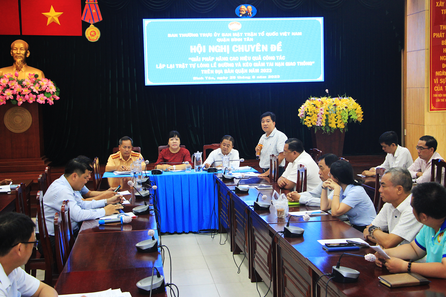 Sáng 25/8, UBMTTQVN quận Bình Tân phối hợp cùng Đội Trật tự đô thị quận và Đội Cảnh sát giao thông quận phối hợp tổ chức Hội nghị chuyên đề “Giải pháp nâng cao hiệu quả công tác lập lại trật tự lòng, lề đường và kéo giảm tai nạn giao thông” trên địa bàn quận Bình Tân năm 2023. Đến dự, có ông Nguyễn Thái Bình - Phó Ban Phong trào UBMTTQVN thành phố. Hội nghị do bà Nguyễn Thanh Nguyệt - Phó Chủ tịch UBMTTQVN quận; ông Nguyễn Hồng Xuân - Đội trưởng Đội Trật tự đô thị quận; Trung tá Trần Văn Trọng - Đội phó Đội Cảnh sát giao thông quận Bình Tân đồng chủ trì.