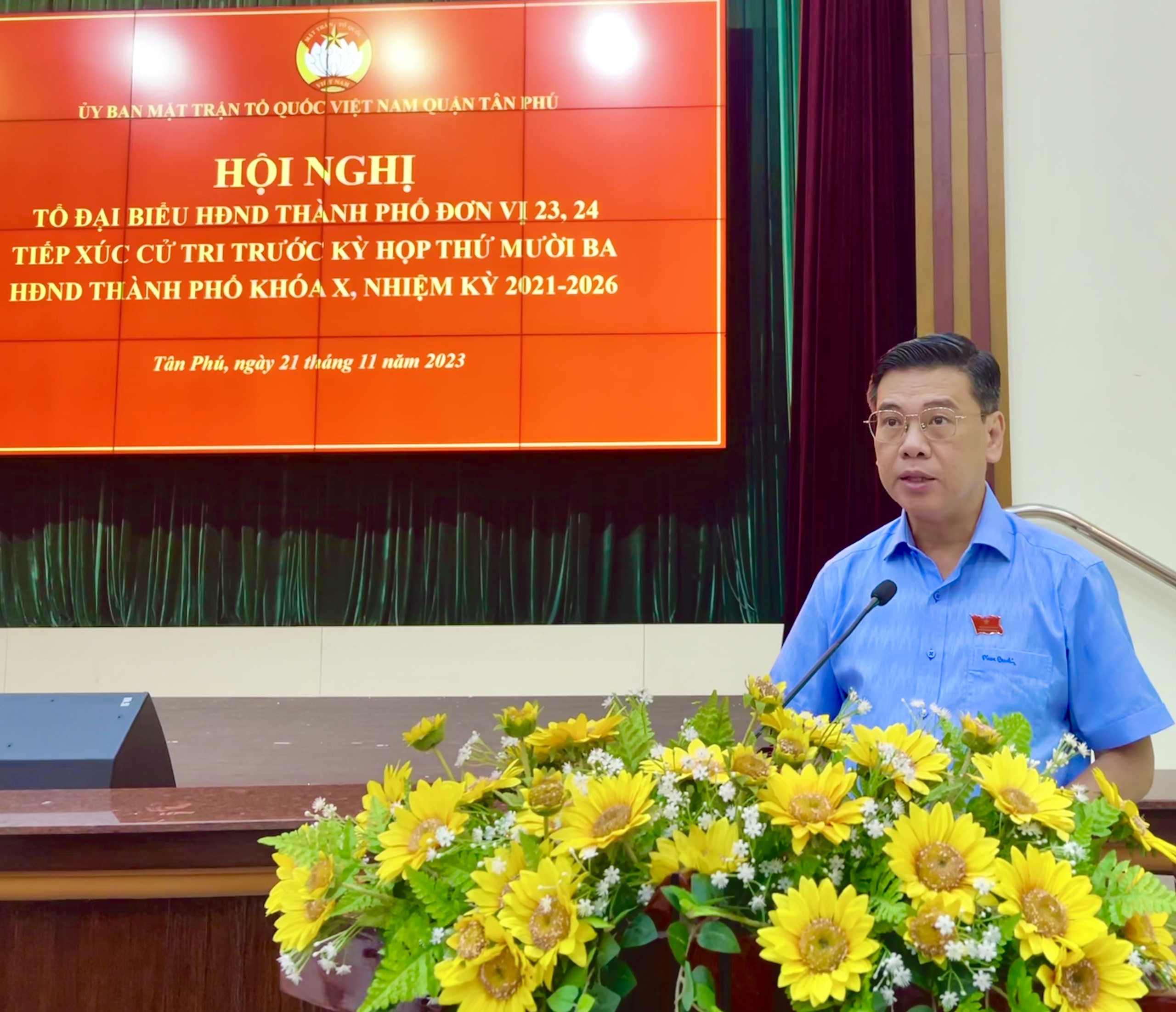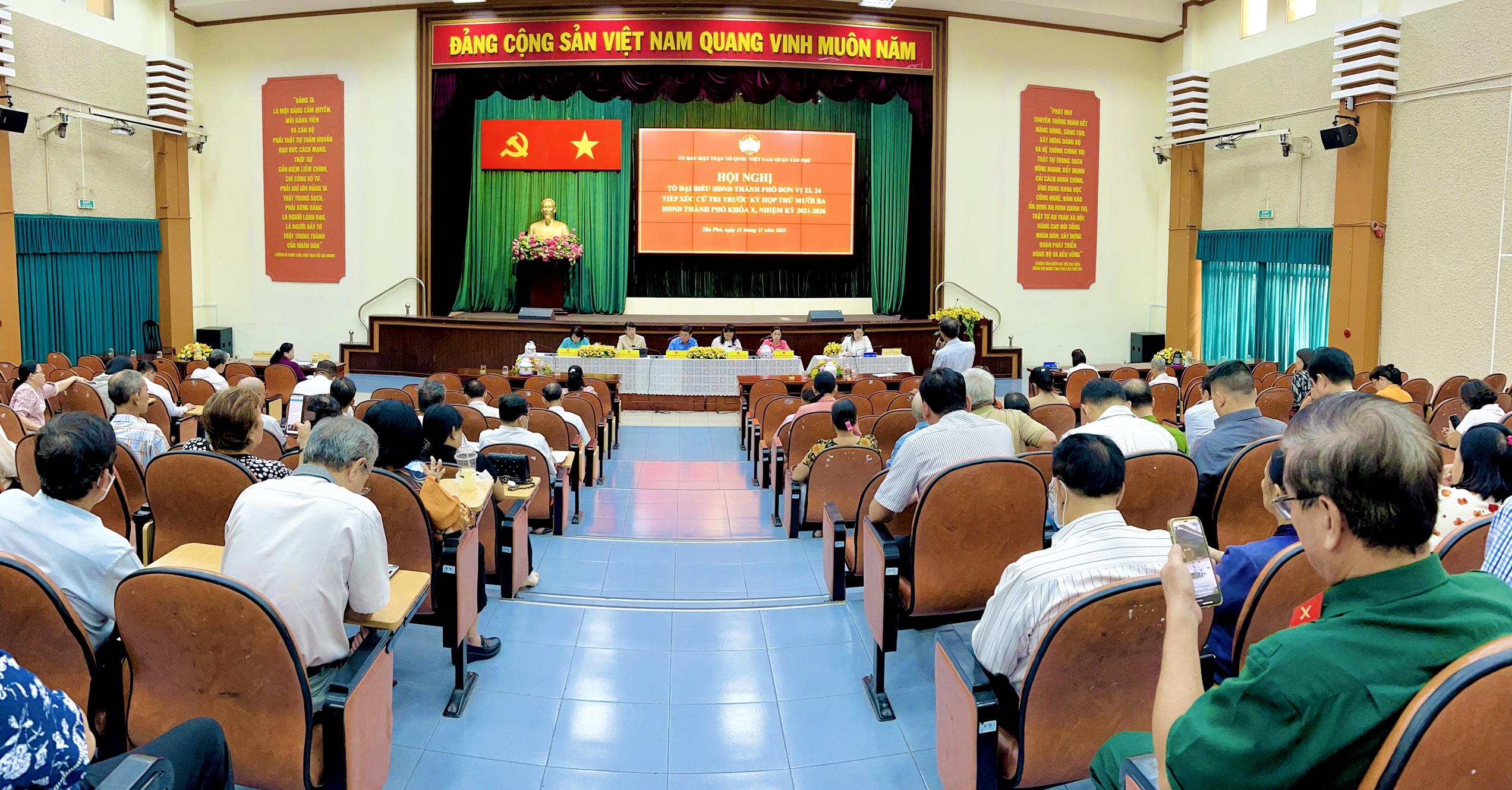 Sáng ngày 21/11/2023, Tổ đại biểu HĐND thành phố Hồ Chí Minh khóa X (đơn vị số 23, 24) nhiệm kỳ 2021-2026 gồm các đại biểu: Nguyễn Văn Dũng - Thành ủy viên, Phó Chủ tịch Ủy ban nhân dân thành phố Hồ Chí Minh; Phạm Thị Thu Hà - Phó Chánh án Tòa án nhân dân thành phố Hồ Chí Minh; Lê Thị Kim Hồng - Bí thư Quận ủy quận Tân Phú; Trần Thị Hồng Nguyệt - Trưởng phòng Dân vận của hệ thống chính trị, Ban Dân vận Thành ủy và đại biểu Phạm Thị Thanh Hương - Ủy viên chuyên trách Ban Đô thị HĐND thành phố Hồ Chí Minh đã có buổi tiếp xúc cử tri quận Tân Phú trước kỳ họp thứ 13 của HĐND Thành phố khóa X, nhiệm kỳ 2021 – 2026.
