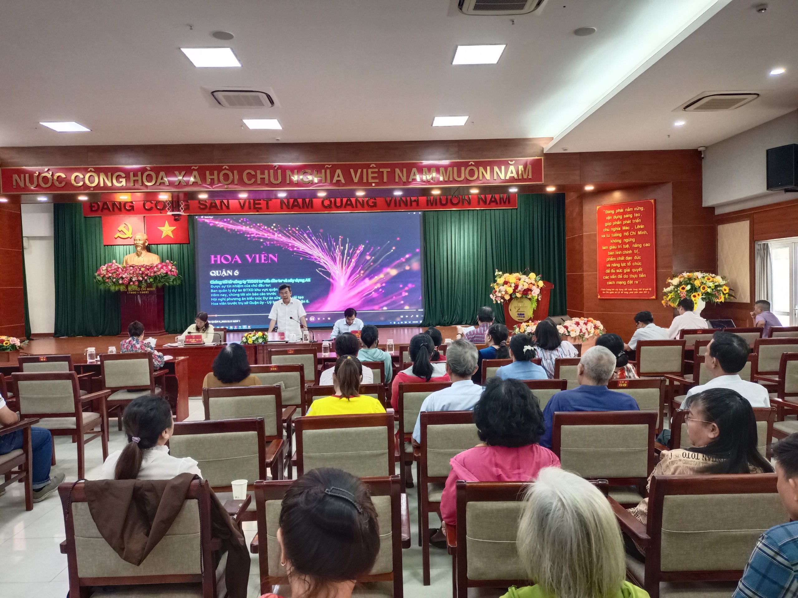Tại Hội nghị, đại diện Công ty TNHH tư vấn đầu tư và xây dựng A.E, trình bày và giới thiệu tổng thể Phương án xây dựng Hoa viên đường Phạm Đình Hổ, Phường 1, Quận 6 (trước trụ sở Quận ủy, Ủy ban nhân dân Quận 6). Trong Hội nghị, đa số đồng tình với Phương án xây dựng mới Hoa viên, có 08 ý kiến của Nhân dân quan tâm, đề nghị xem xét kỷ lưỡng, nên bố trí nhà vệ sinh công cộng khu vực này; khu vực đường Bãy Sậy - Phan Văn Khỏe, đoạn giáp Hoa viên có được đầu tư xây dựng không, gì nơi đây là khu vực giải tỏa kênh Hàng Bàng (giai đoạn 3), nếu không tính toán kỷ sẽ không hài hòa, ảnh hưởng đến vệ sinh môi trường; việc bố trí Logo của Quận nên xem xét, tính toán đặt nơi nào cho trang trọng hơn, vì theo Phương án Logo nằm trên nền gạch thì không hợp lý; việc trồng cây xanh và hoa cần phải có thiết kế mới, mang tính độc đáo hơn, vì đây là bộ mặt của Quận và đề nghị sớm hoàn chỉnh để triển khai sớm.