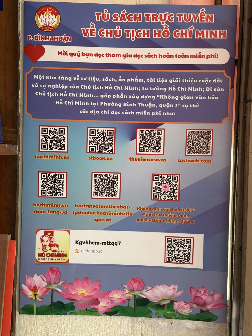 Đồng thời, Ủy ban MTTQ phường Bình Thuận cũng ra mắt tủ sách trực tuyến về Chủ tịch Hồ Chí Minh gồm có các tư liệu, sách, ấn phẩm, tài liệu chính thống giới thiệu về cuộc đời, sự nghiệp của Chủ tịch Hồ Chí Minh,.. và tuyên truyền vận động người dân tham gia tải app Không gian văn hóa trực tuyến (có 5 thứ tiếng: Việt, Anh, Hàn, Trung, Nhật) của Mặt trận Quận 7.