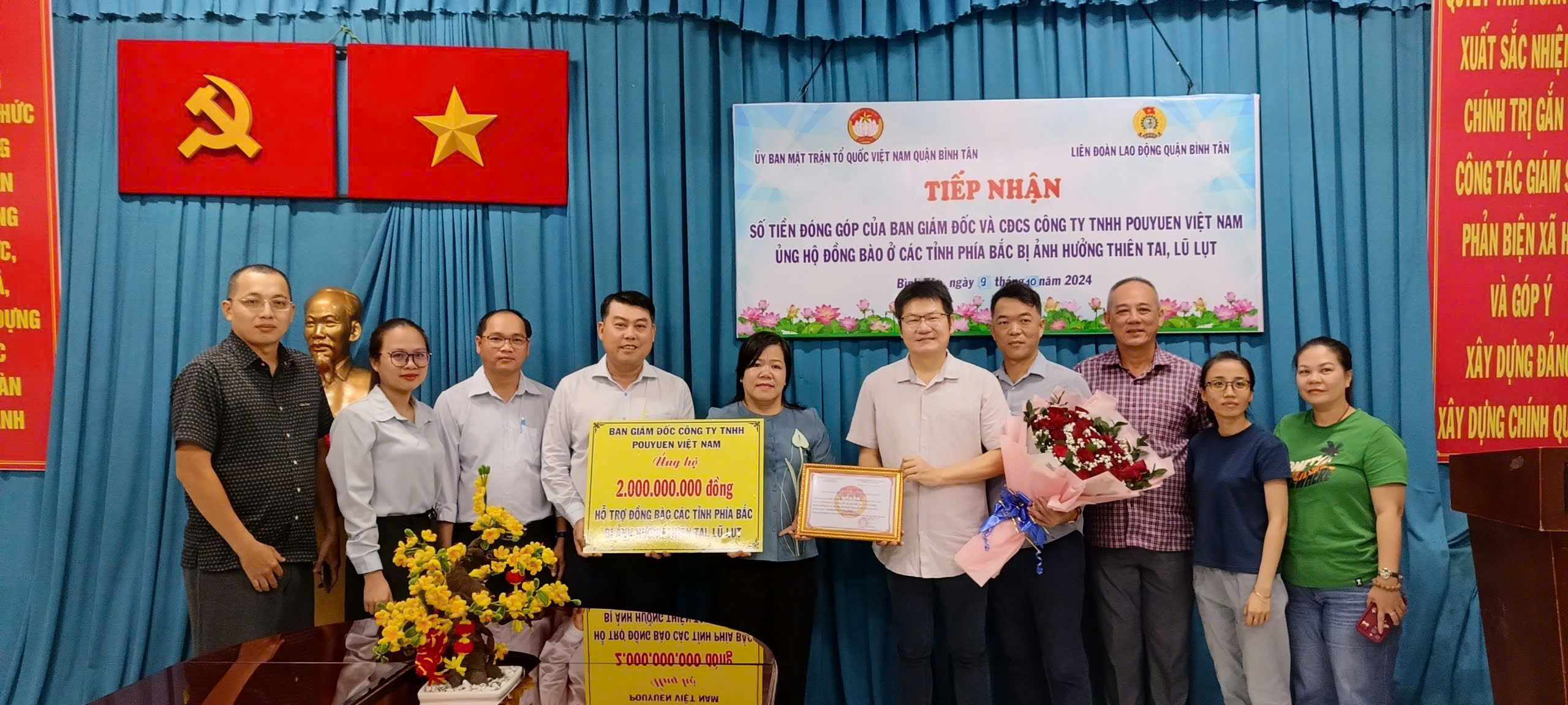 Dịp này, Ban giám đốc Công ty TNHH PouYuen Việt Nam đã trao tặng 2.000.000.000đ (hai tỷ đồng) để tiếp tục ủng hộ cho đồng bào miền Bắc bị thiên tai. Trước đó, Ban giám đốc đã phát động trong cán bộ, công nhân, người lao động và công đoàn viên Công ty TNHH PouYuen Việt Nam chung tay ủng hộ đồng bào miền Bắc giúp khắc phục những thiệt hại bão lũ gây ra với số tiền là 1.474.186.000đ (một tỷ bốn trăm bảy mươi bốn triệu một trăm tám mươi sáu ngày đồng), tổng số tiền Công ty TNHH PouYuen Việt Nam đóng góp ủng hộ cho đồng bào miền Bắc bị thiên tai là 3.474.186.000đ (ba tỷ bốn trăm bảy mươi bốn triệu một trăm tám mươi sáu ngày đồng).