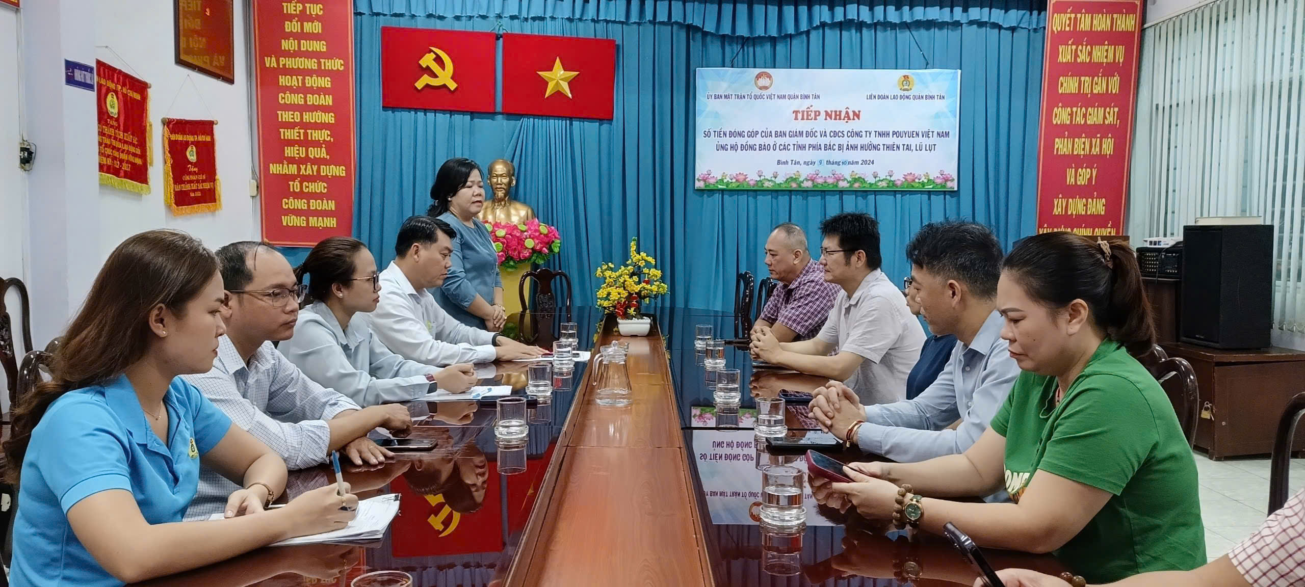 Chiều ngày 09/10/2024, tại Hội trường Nhà Văn hóa Lao động Quận, Ủy ban Mặt trận Tổ quốc Việt Nam quận Bình Tân phối hợp với Liên đoàn Lao động Quận tổ chức tiếp nhận kinh phí của Ban Giám đốc Công ty TNHH Pouyuen Việt Nam ủng hộ đồng bào các tỉnh phía Bắc bị ảnh hưởng thiên tai, lũ lụt.