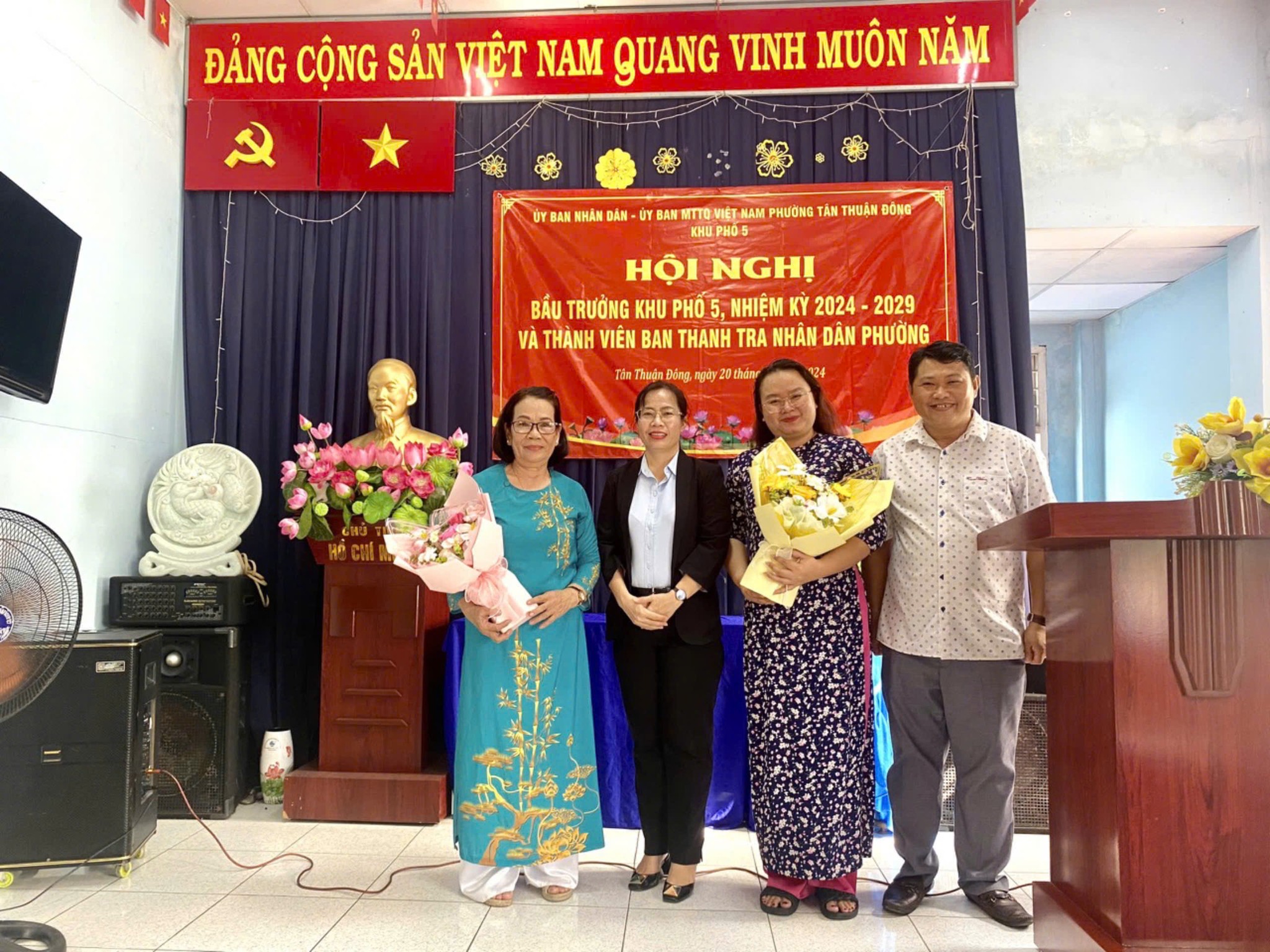 Trao tặng hoa cho Trưởng khu phố và thành viên Ban Thanh tra Nhân dân được người dân tín nhiệm bầu cử tại phường Tân Thuận Đông