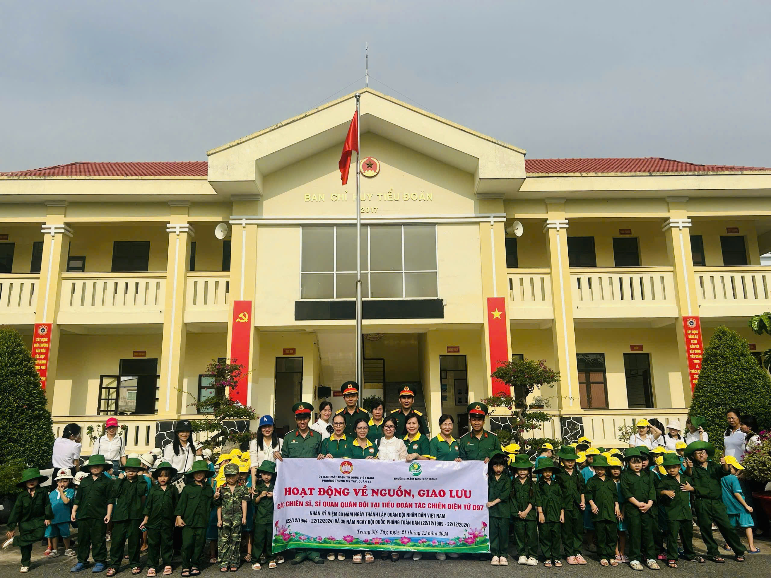 Nhân dịp kỷ niệm 80 năm Ngày thành lập Quân đội Nhân dân Việt Nam (22/12/1944 - 22/12/2024) và 35 năm Ngày hội Quốc phòng toàn dân (22/12/1989 - 22/12/2024), sáng ngày 21/12/2024, Ủy ban Mặt trận Tổ quốc Việt Nam phường Trung Mỹ Tây phối hợp với trường Mầm non Sóc Bông đã tổ chức chương trình về nguồn và giao lưu tại Tiểu đoàn Tác chiến điện tử D97, có sự tham gia của 120 em thiếu nhi. Tại Tiểu đoàn D97, các em thiếu nhi đã được trải nghiệm nhiều hoạt động bổ ích: Tham dự nghi thức chào cờ và diễu hành, giúp các em hiểu thêm về tinh thần kỷ luật quân đội; hướng dẫn sắp xếp nội vụ và tham gia các bài tập thể dục rèn luyện sức khỏe, nâng cao ý thức về nề nếp và kỷ luật; giao lưu văn nghệ, tạo không khí vui tươi và gắn kết giữa các em và các chiến sĩ; tặng quà cho các chiến sĩ và sĩ quan, thể hiện lòng biết ơn và tình cảm đối với những người bảo vệ Tổ quốc.