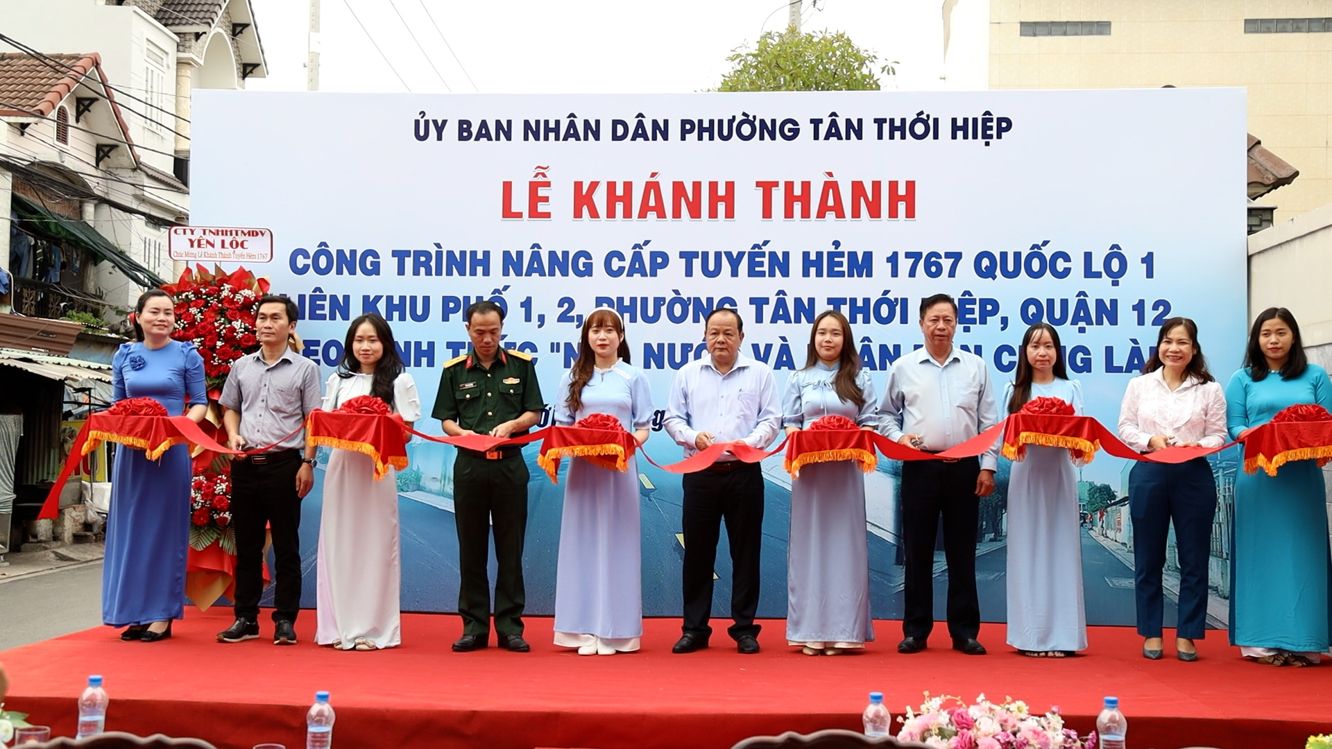 Lãnh đạo UBND Quận 12 và Lãnh đạo phường Tân Thới Hiệp thực hiện nghi thức cắt băng khánh thành Công trình nâng cấp tuyến Hẻm 1767, Quốc lộ 1