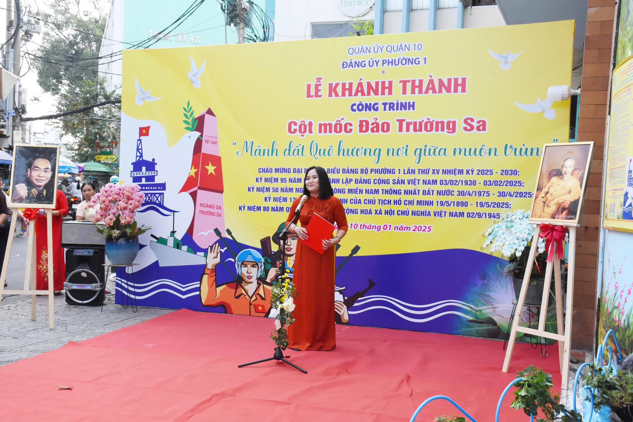 Phát biểu tại buổi lễ, bà Trần Nguyễn Phương Minh – Bí thư Đảng uỷ Phường 1 cho biết công trình Cột mốc đảo Trường Sa “Mảnh đất quê hương nơi giữa muôn trùng” được triển khai xây dựng từ cuối tháng 12/2024, chiều cao 3.15m, diện tích 5.04 m2 với tổng kinh phí thực hiện công trình gần 35 triệu đồng. Mô hình được làm bằng bê tông xây ốp gạch phần đế, phần thân được làm bằng chất liệu Aluminium, formex, thiết kế phía trên là Quốc hiệu nước CHXHCN Việt Nam, tiếp theo là biểu tượng lá cờ Tổ quốc, biểu tượng địa danh, tọa độ địa lý (vĩ độ, kinh độ của đảo Trường Sa), cuối cùng là biểu tượng mặt trống đồng dưới dạng những đường tròn đồng tâm hướng về cột mốc chủ quyền quần đảo Trường Sa, thể hiện sự đồng lòng, đoàn kết của dân tộc Việt Nam.
