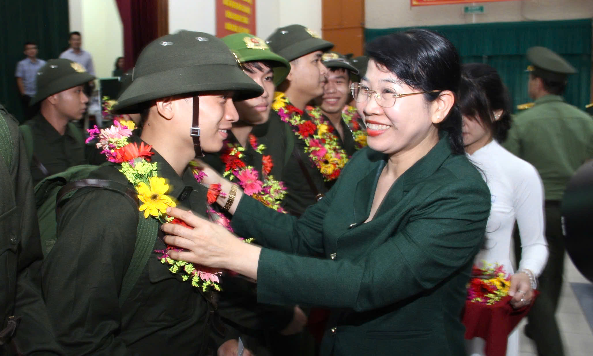 Đ/c Lê Thị Kim Hồng - Bí thư Quận ủy tặng hoa chúc mừng thanh niên trúng tuyển nghĩa vụ quân sự