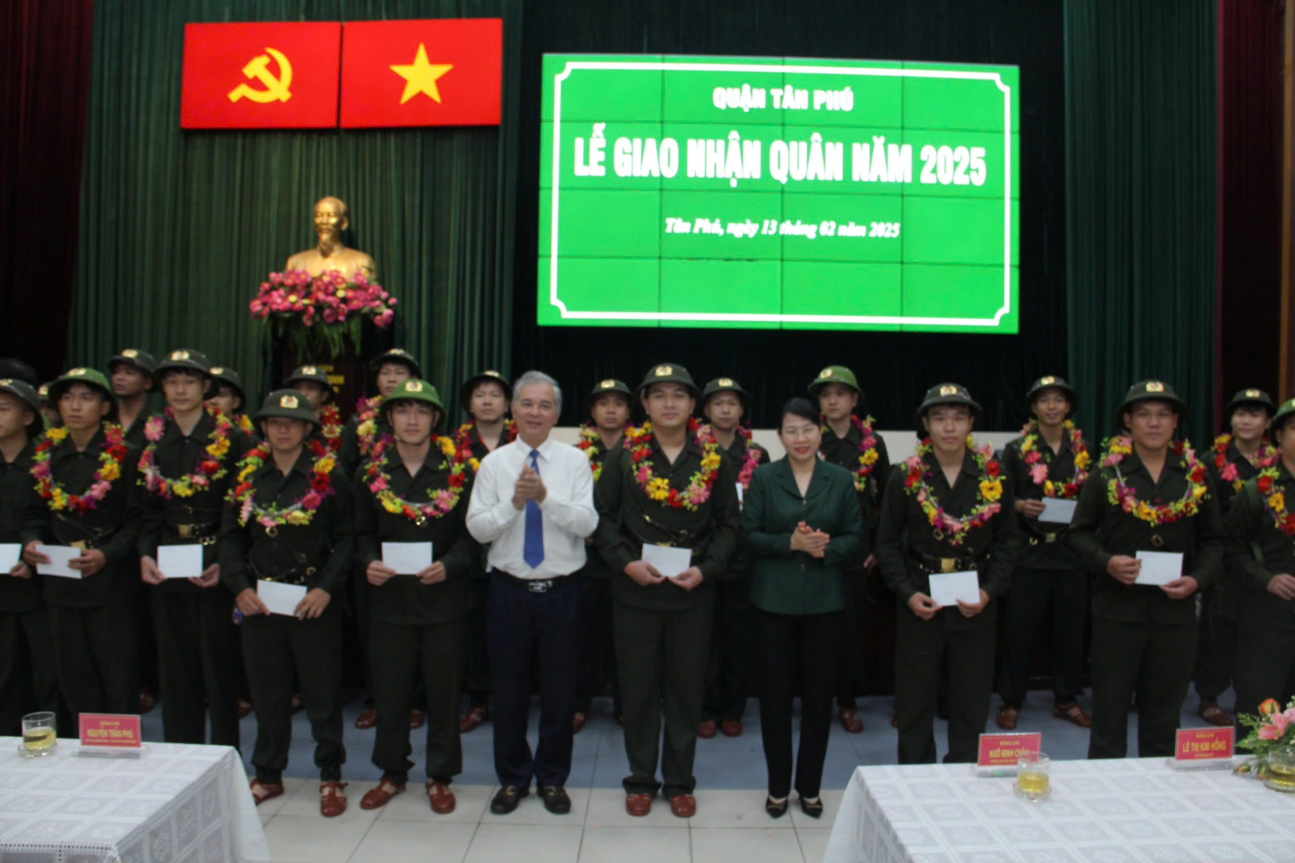 Sáng 13/02/2025, Hội đồng nghĩa vụ Quận sự quận Tân Phú đã long trọng tổ chức Lễ giao quân năm 2025. Đến dự, có đồng chí Ngô Minh Châu - Thành ủy viên, Trưởng Ban Nội chính Thành ủy; Thượng tá Nguyễn Văn Sản - Phó Chủ nhiệm Chính trị, Bộ Tư lệnh Thành phố; đồng chí Lê Thị Kim Hồng - Bí thư Quận ủy; đồng chí Phạm Hưng Quốc Bảo - Phó Bí thư Thường trực Quận ủy; đồng chí Nguyễn Trần Phú - Phó Bí thư Quận ủy, Chủ tịch Ủy ban nhân dân, Chủ tịch Hội đồng nghĩa vụ Quận sự quận; các đồng chí Ủy viên Ban Thường vụ Quận ủy, lãnh đạo các Ban xây dựng Đảng; thành viên Hội đồng nghĩa vụ Quận sự quận; các ban ngành, đoàn thể quận, phường; Đảng ủy, Ủy ban nhân dân 11 phường và đại diện các đơn vị nhận quân.