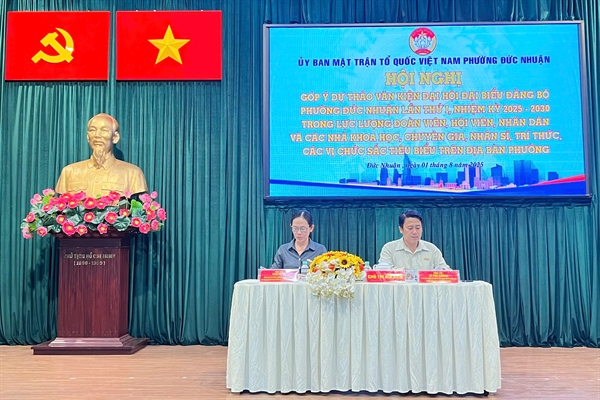 Ngày 01/8, tại Hội trường Đảng ủy phường Đức Nhuận, Ủy ban MTTQ Việt Nam phường tổ chức Hội nghị lấy ý kiến góp ý dự thảo văn kiện Đại hội đại biểu Đảng bộ phường Đức Nhuận lần thứ I, nhiệm kỳ 2025 - 2030. Hội nghị có sự tham gia của lực lượng đoàn viên, hội viên, Nhân dân, các nhà khoa học, chuyên gia, nhân sĩ, trí thức và các vị chức sắc tiêu biểu đang sinh sống, công tác trên địa bàn phường.