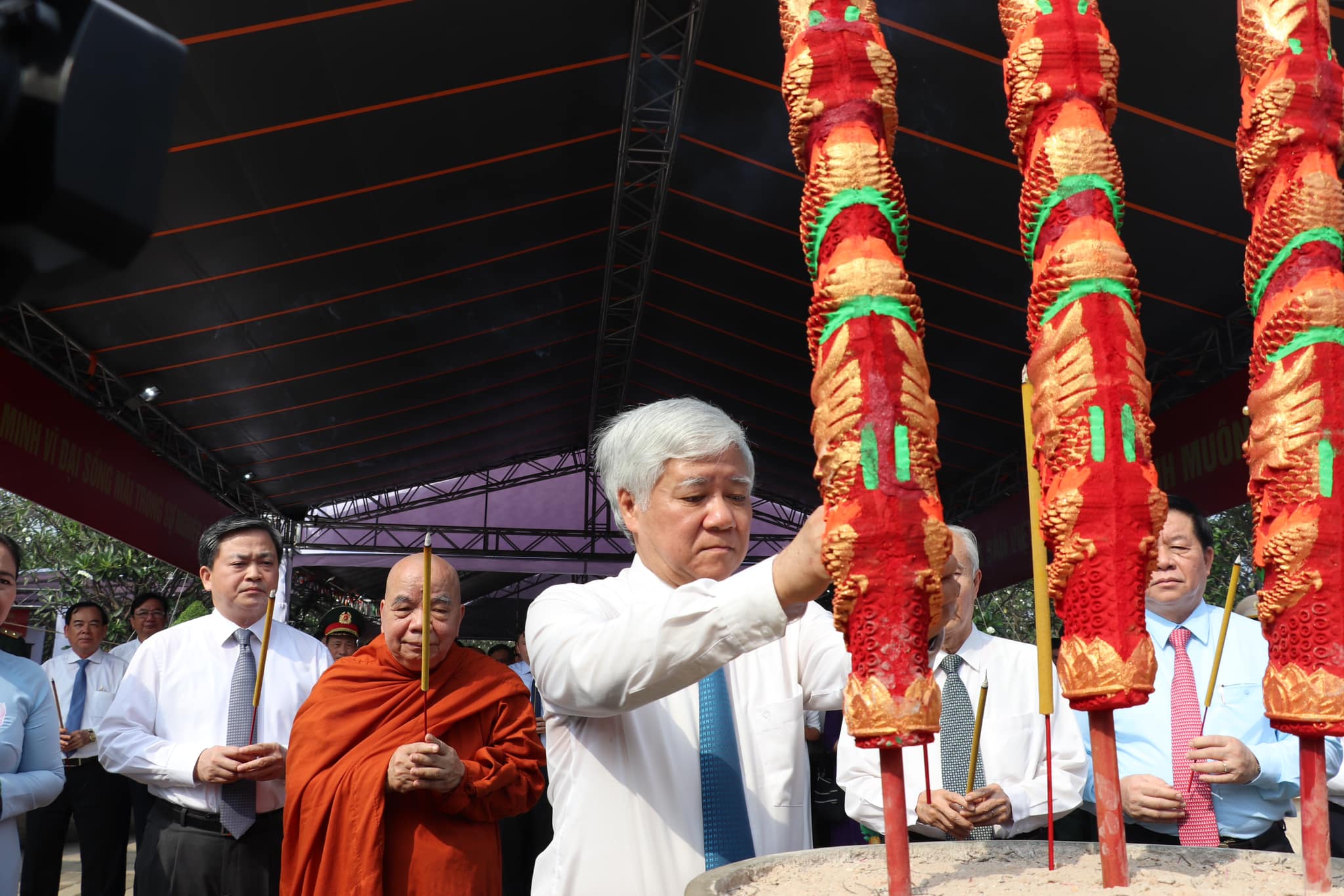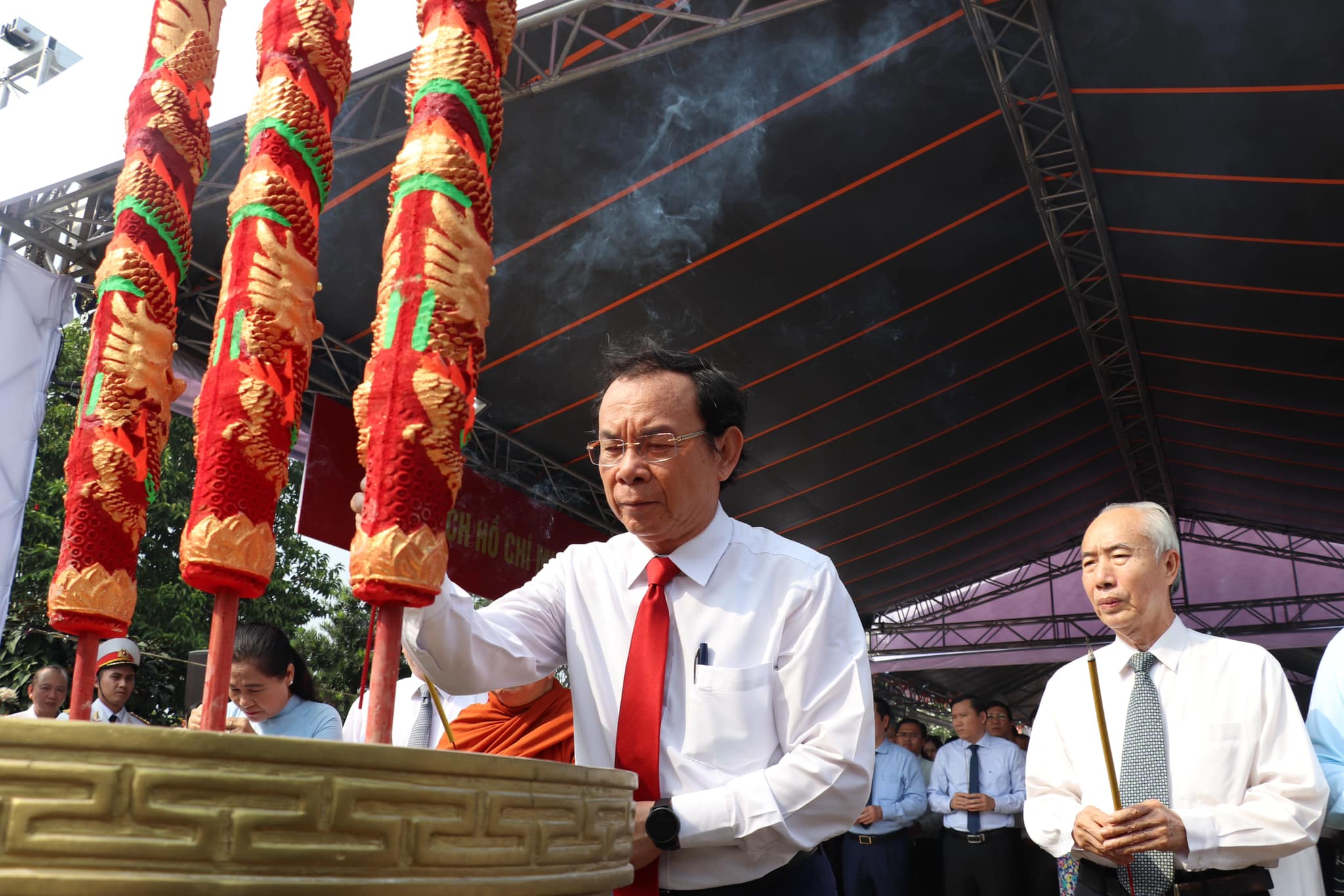 Tham gia đoàn, có ông Nguyễn Văn Nên, Ủy viên Bộ Chính trị, Bí thư Thành ủy TP.HCM; ông Nguyễn Trọng Nghĩa, Bí thư Trung ương Đảng, Trưởng Ban Tuyên giáo Trung ương; ông Đỗ Văn Chiến, Bí thư Trung ương Đảng, Chủ tịch Ủy ban Trung ương MTTQ Việt Nam; ông Huỳnh Đảm, nguyên Ủy viên Trung ương Đảng, nguyên Chủ tịch Ủy ban Trung ương MTTQ Việt Nam; ông Phan Văn Mãi, Ủy viên Trung ương Đảng, Phó Bí thư Thường trực Thành ủy, Chủ tịch UBND TP.HCM; ông Lê Đức Thọ, Ủy viên Trung ương Đảng, Bí thư Tỉnh ủy Bến Tre; GS.TS Lê Văn Lợi, Phó Giám đốc Học viện Chính trị Quốc gia Hồ Chí Minh; bà Nguyễn Thị Lệ, Phó Bí thư Thành ủy, Chủ tịch HĐND TPHCM; ông Phan Nguyễn Như Khuê, Ủy viên Ban Thường vụ Thành ủy, Trưởng Ban Tuyên giáo Thành ủy TPHCM; các đại biểu nhân sĩ, trí thức, tôn giáo, dân tộc…