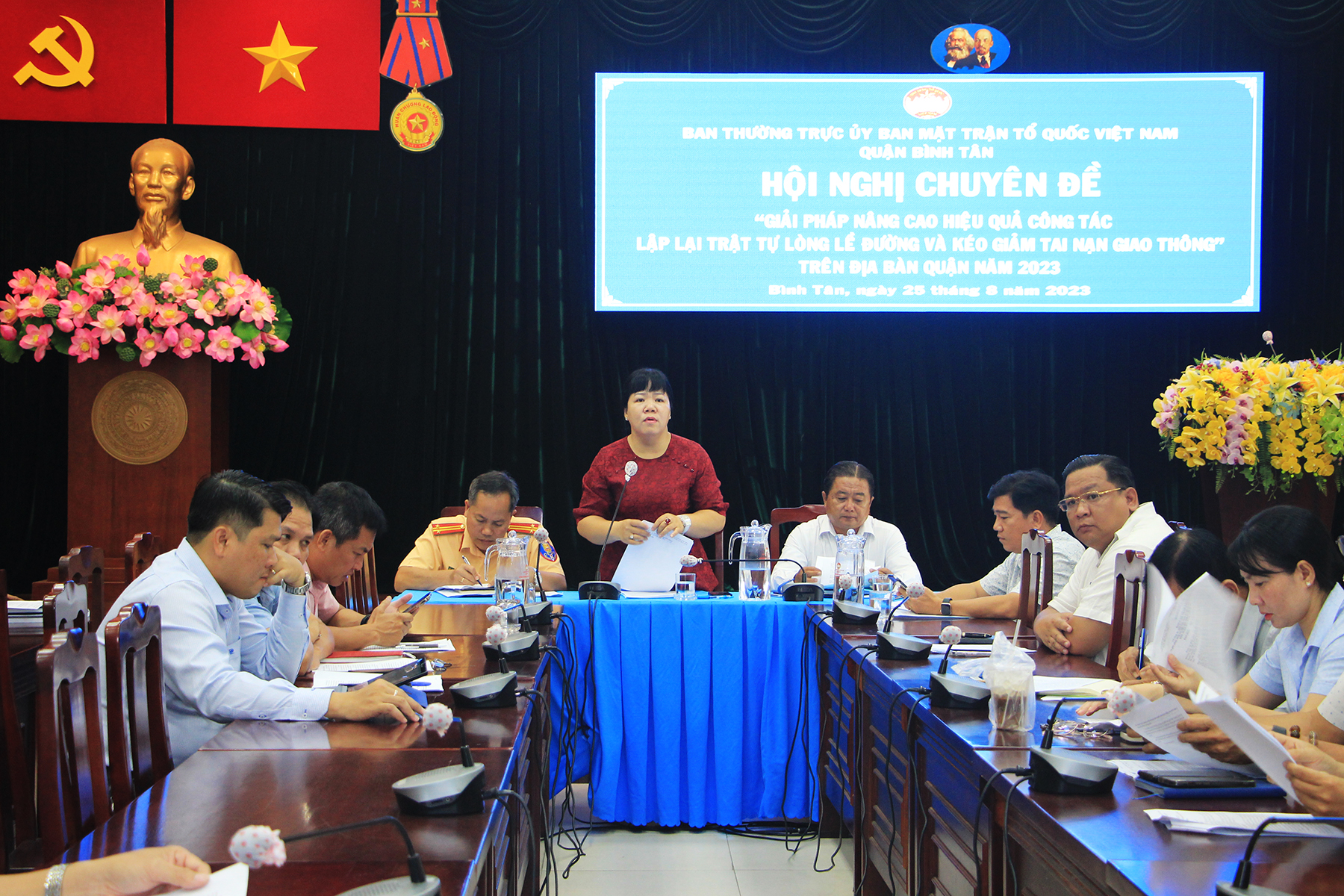 Bên cạnh đó, thời gian qua, UBMTTQVN quận Bình Tân còn phối hợp với UBND quận và các tổ chức chính trị - xã hội quận thực hiện tốt Chương trình thực hiện cuộc vận động “Toàn dân đoàn kết xây dựng nông thôn mới, đô thị văn minh” giai đoạn 2021 - 2025. Nhiều hội nghị, hội thi, các buổi tập huấn cùng những giải pháp thực hiện triệt để nhằm lập lại trật tự lòng, lề đường và kéo giảm tai nạn giao thông cũng đã thể hiện trên địa bàn 10 phường. Nhất là chú trọng việc nâng cao nhận thức người dân về trật tự lòng, lề đường với nhiều giải pháp thực hiện, thông qua xây dựng các mô hình gắn với 13 tiêu chí xây dựng khu dân cư sạch - đẹp - an toàn. Tuy nhiên tất cả đều chưa đạt được như mong muốn. Vì thế trong hội nghị này, Ban tổ chức mong muốn có nhiều ý kiến, kiến nghị, hiến kế để công tác lập lại trật tự lòng, lề đường và kéo giảm tai nạn giao thông ngày càng đạt thêm nhiều kết quả như mong muốn.