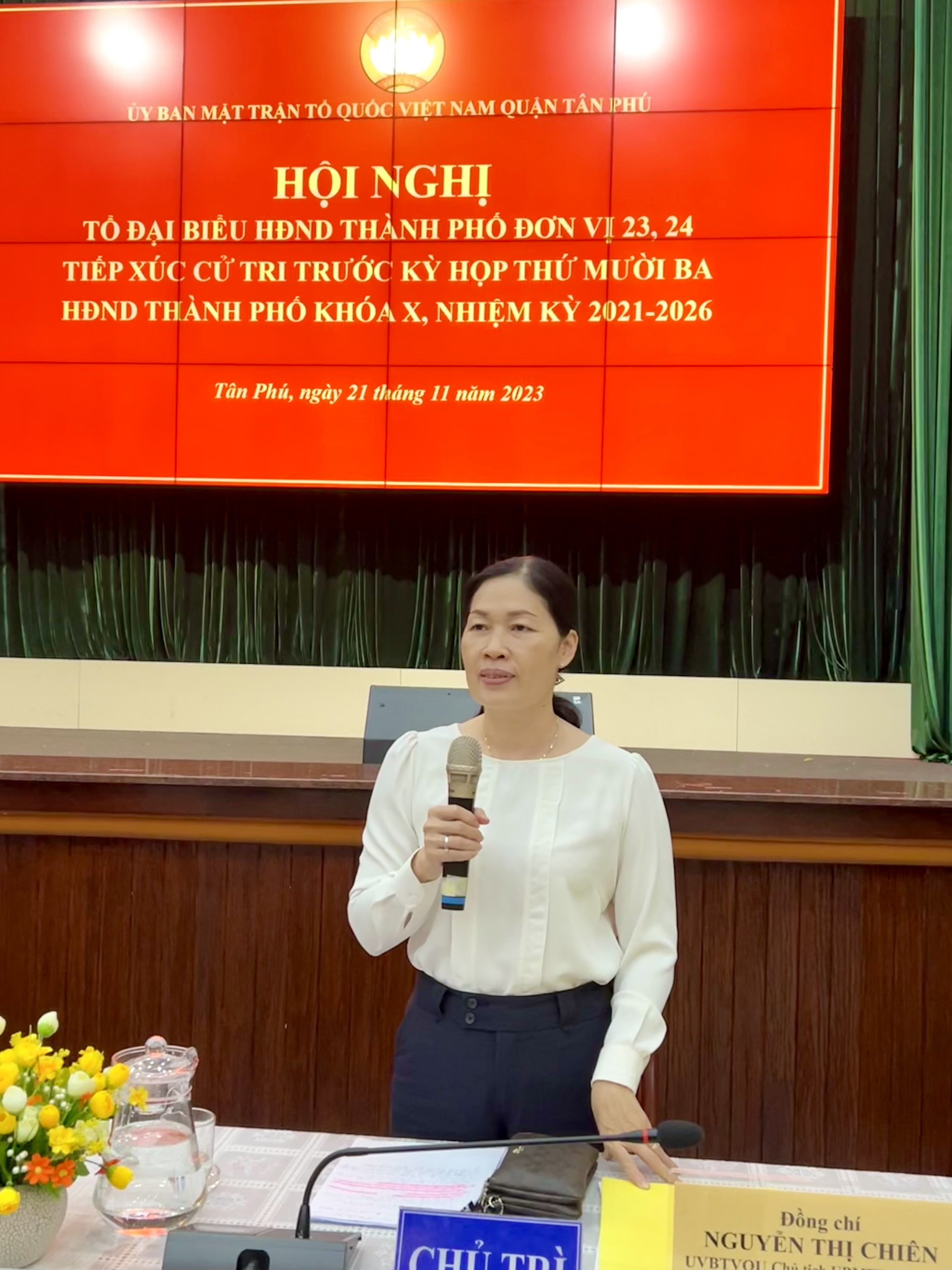 Bà Nguyễn Thị Chiên, Chủ tịch Ủy ban Mặt trận Tổ quốc Việt Nam quận Tân Phú điều hành phần lấy ý kiến phát biểu cử tri tại hội nghị