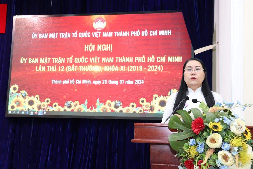 Sáng 25/01, Ủy ban MTTQ Việt Nam TP.HCM tổ chức Hội nghị lần thứ 12 Ủy ban MTTQ Thành phố khóa XI, nhiệm kỳ 2019 - 2024 (hội nghị bất thường) để Hiệp thương nhân sự Ủy viên Ủy ban MTTQ Việt Nam TP.HCM và lấy ý kiến đối với một số nội dung liên quan đến công tác chuẩn bị tổ chức Đại hội đại biểu MTTQ Việt Nam TP.HCM lần thứ XII, nhiệm kỳ 2024 - 2029.