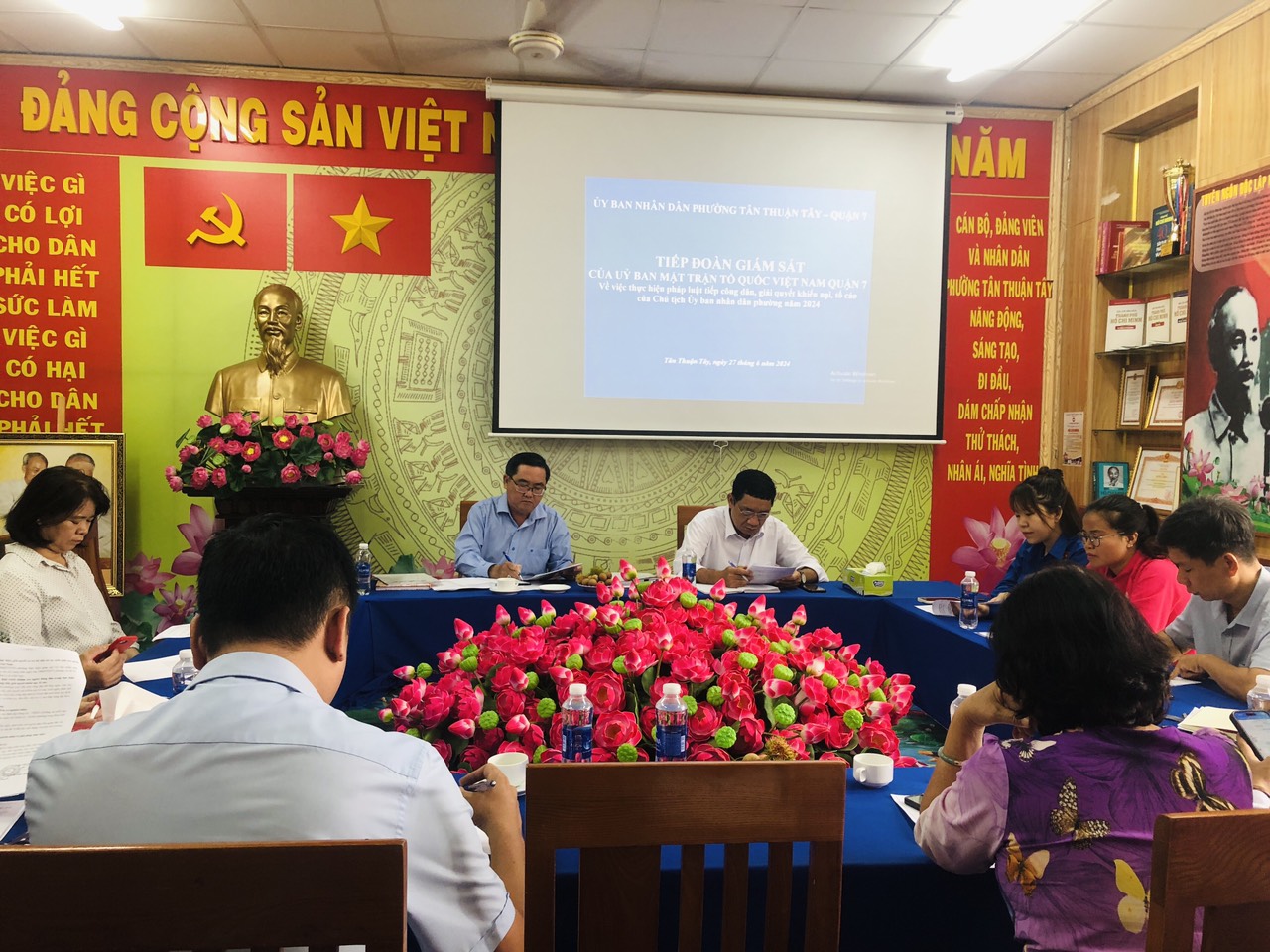Ngày 27/6, đoàn giám sát của Ủy ban MTTQ VIệt Nam Quận 7, do ông Khưu Thiên Thành, Phó Chủ tịch Ủy ban MTTQ Việt Nam quận làm trưởng đoàn, đã có buổi làm việc tại UBND phường Tân Thuận Tây, về công tác tiếp công dân và giải quyết khiếu nại, tố cáo.