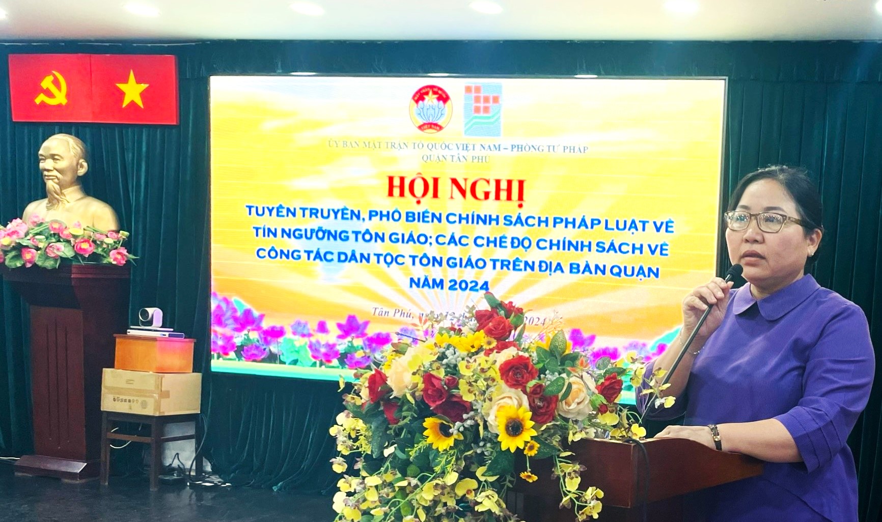 Sáng 12/7, Ủy ban MTTQ Việt Nam quận Tân Phú đã phối hợp phòng Tư pháp quận tổ chức Hội nghị tuyên truyền, phổ biến chính sách pháp luật về tín ngưỡng tôn giáo; các chế độ chính sách về công tác dân tộc tôn giáo. Tham dự hội nghị, có ông Thạch Nghi Xuân, Ủy viên Thường trực, Trưởng ban Dân tộc - Tôn giáo Ủy ban MTTQ Việt Nam TPHCM; bà Nguyễn Ngọc Trâm, Phó Chủ tịch Thường trực Ủy ban MTTQ Việt Nam quận; bà Bùi Thị Trang, Phó Trưởng phòng Tư pháp quận; Hòa thượng Thích Thiện Hòa, Ủy viên Ban Trị sự Giáo hội Phật giáo (BTS GHPG) Việt Nam Thành phố, Trưởng BTS GHPG Việt Nam quận Tân Phú; đại diện Ban Thường trực Ủy ban MTTQ Việt Nam 11 phường; Trưởng ban Công tác Mặt trận (CTMT) các khu dân cư; các vị chức sắc, chức việc các tôn giáo cùng các ông, bà thành viên Ban Tư vấn về dân tộc, tôn giáo của Ủy ban MTTQ Việt Nam quận.