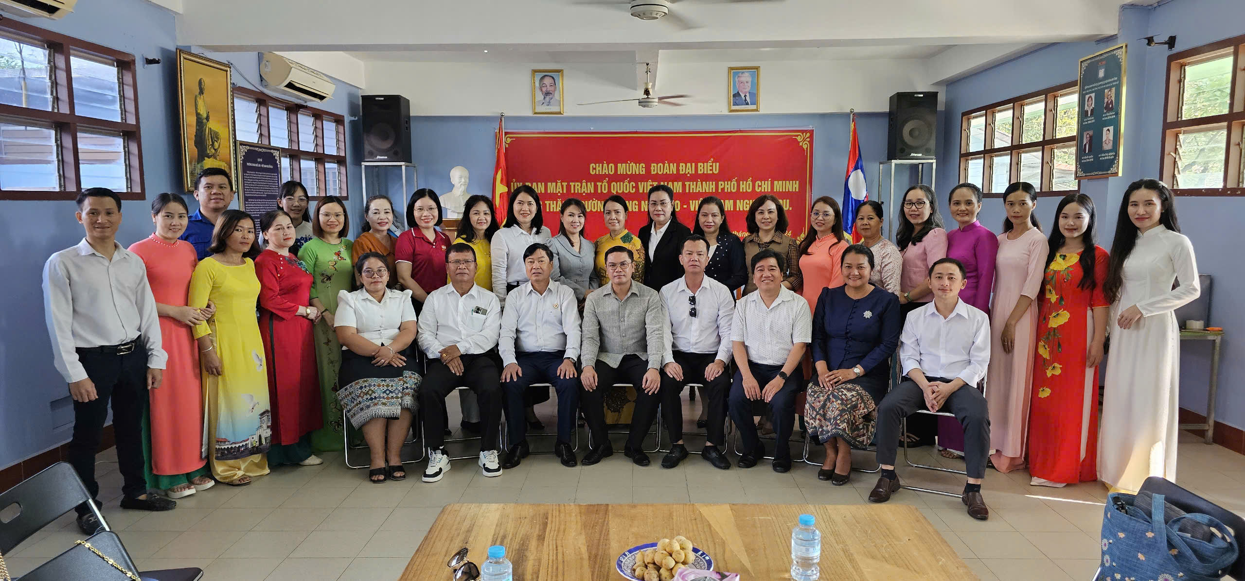 Đoàn đại biểu Uỷ ban MTTQ Việt Nam TP.Hồ Chí Minh chụp hình lưu niệm cùng thầy cô Trường song ngữ Lào - Việt Nam Nguyễn Du