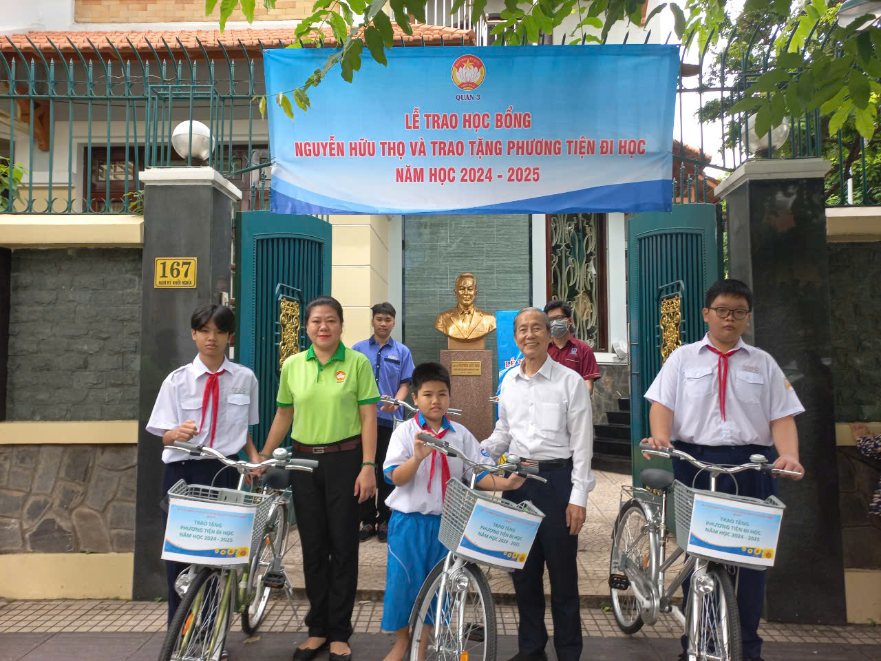 Ông Nguyễn Hữu Châu trao xe đạp cho học sinh khó khăn