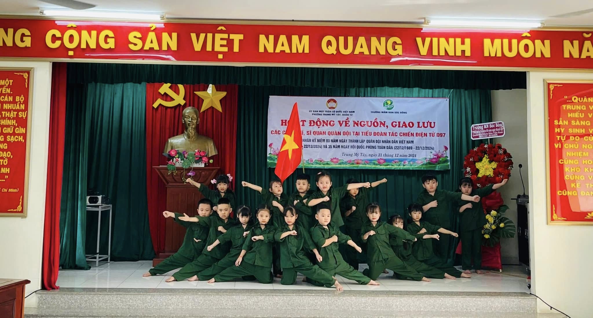 Nhân dịp kỷ niệm 80 năm Ngày thành lập Quân đội Nhân dân Việt Nam (22/12/1944 - 22/12/2024) và 35 năm Ngày hội Quốc phòng toàn dân (22/12/1989 - 22/12/2024), sáng ngày 21/12/2024, Ủy ban Mặt trận Tổ quốc Việt Nam phường Trung Mỹ Tây phối hợp với trường Mầm non Sóc Bông đã tổ chức chương trình về nguồn và giao lưu tại Tiểu đoàn Tác chiến điện tử D97, có sự tham gia của 120 em thiếu nhi. Tại Tiểu đoàn D97, các em thiếu nhi đã được trải nghiệm nhiều hoạt động bổ ích: Tham dự nghi thức chào cờ và diễu hành, giúp các em hiểu thêm về tinh thần kỷ luật quân đội; hướng dẫn sắp xếp nội vụ và tham gia các bài tập thể dục rèn luyện sức khỏe, nâng cao ý thức về nề nếp và kỷ luật; giao lưu văn nghệ, tạo không khí vui tươi và gắn kết giữa các em và các chiến sĩ; tặng quà cho các chiến sĩ và sĩ quan, thể hiện lòng biết ơn và tình cảm đối với những người bảo vệ Tổ quốc.