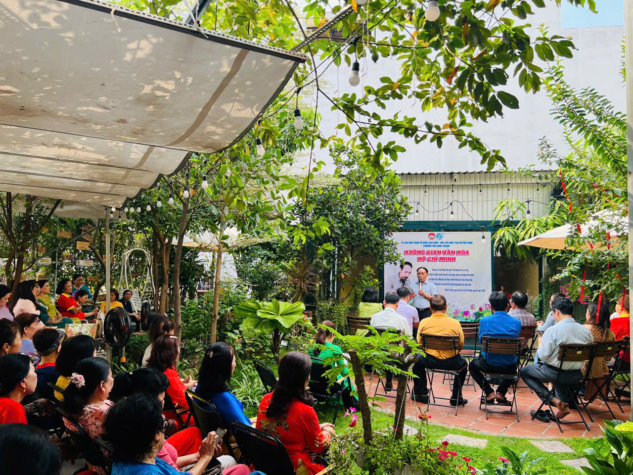 Đông đảo hội viên phụ nữ và người dân tham dự Lễ ra mắt Không gian Văn hóa Hồ Chí Minh tại quán Hoa Nắng (phường Tân Hưng Thuận)
