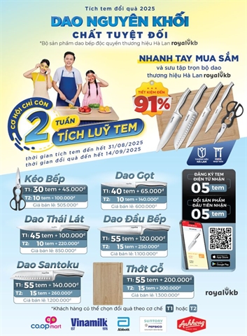 Bên cạnh các chương trình khuyến mãi hấp dẫn, thiết thực tập trung các nhóm hàng dinh dưỡng bổ sung khoáng chất và vitamin để các em học sinh sẵn sàng một thể chất khỏe mạnh và trí tuệ minh mẫn bước vào năm học mới 2025 - 2026, Liên hiệp Hợp tác xã Thương mại TP.HCM (Saigon Co.op) phối hợp với các thương hiệu Việt hàng đầu trong ngành dinh dưỡng như bánh flan và thạch dừa Ánh Hồng, sữa tươi tiệt trùng Green Farm, sữa chua ăn Vinamilk tặng thêm cho các bậc phụ huynh thêm 1 tem thưởng khi mua các sản phẩm trên cho con em được áp dụng trong chương trình “Săn tem thưởng - Đổi quà nhanh” khi chỉ còn 2 tuần, từ nay đến 31/8/2025 để tích lũy tem nhanh tay đổi các sản phẩm dao bếp RoyalVKB hoặc trọn bộ 6 món gồm dao bếp, dao thái lát, dao santoku, dao gọt, kéo bếp và thớt gỗ trong khuôn khổ chương trình “Tích tem đổi quà 2025”. Khách hàng đổi quà tại hệ thống Co.opmart, Co.opXtra, Finelife từ nay đến hết 14/9/2025.