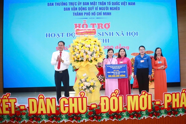 và trao bảng tượng trưng 300 triệu đồng cho cho đại diện Ủy ban MTTQ Việt Nam xã Củ Chi để thực hiện công tác an sinh xã hội.