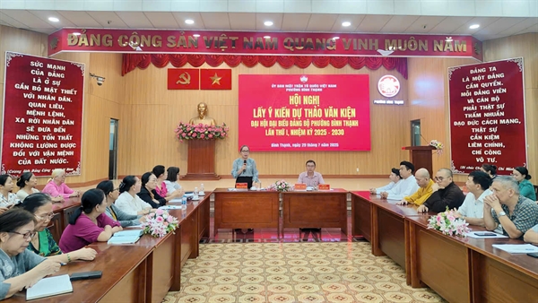 Ngày 29/7, tại Hội trường A Đảng ủy phường, Ban Thường trực Ủy ban MTTQ Việt Nam phường Bình Thạnh tổ chức Hội nghị lấy ý kiến góp ý của Nhân dân đối với dự thảo Báo cáo chính trị trình Đại hội đại biểu Đảng bộ phường lần thứ I, nhiệm kỳ 2025 - 2030.