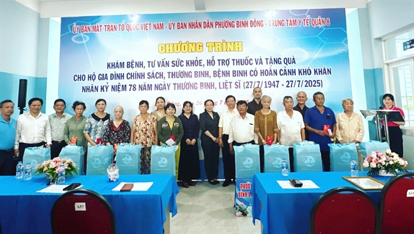 Ngày 26/7, Ủy ban MTTQ Việt Nam phường Bình Đông phối hợp UBND phường và Trung tâm y tế Quận 8 tổ chức khám bệnh, tư vấn sức khỏe, hỗ trợ thuốc và tặng quà cho hộ gia đình chính sách, thương binh, bệnh binh có hoàn cảnh khó khăn trên địa bàn.