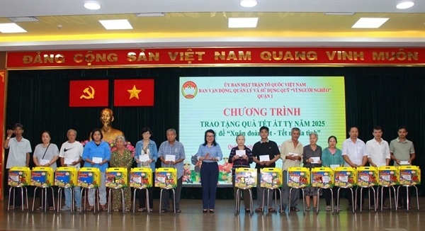 Ban vận động Vì người nghèo - Ủy ban Mặt trận Tổ quốc Việt Nam Quận 1 tổ chức buổi họp mặt trao quà Tết Ất Tỵ 2025 cho hộ cận nghèo, hộ dân tộc thiểu số có hoàn cảnh khó khăn trên địa bàn quận