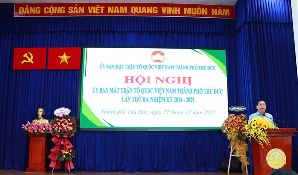 Sáng ngày 27/12, UB.MTTQ Việt Nam TP Thủ Đức tổ chức hội nghị UB.MTTQ Việt Nam thành phố lần thứ ba, nhiệm kỳ 2024 - 2029, nhằm tổng kết, đánh giá kết quả công tác Mặt trận năm 2024 và thảo luận, góp ý phương hướng, nhiệm vụ trọng tâm năm 2025.