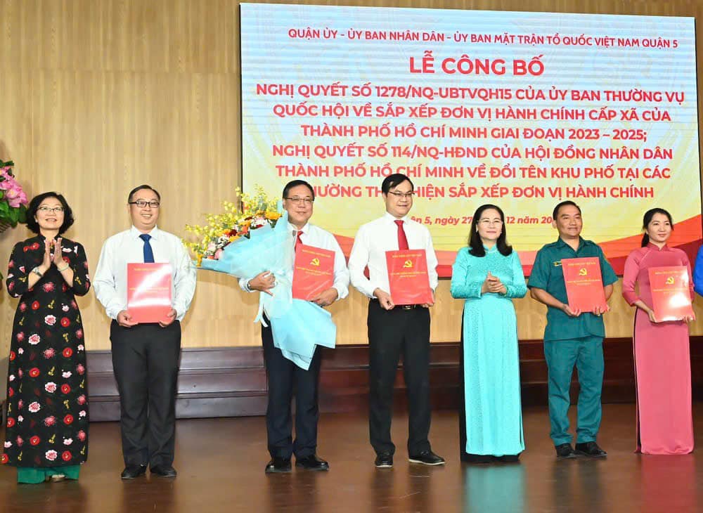 Sáng 27-12, quận 5 (TPHCM) tổ chức Lễ công bố Nghị quyết 1278 của Ủy ban Thường vụ Quốc hội về sắp xếp đơn vị hành chính cấp xã của TPHCM giai đoạn 2023-2025; Nghị quyết 114/NQ-HĐND của HĐND TPHCM về đổi tên khu phố tại các phường sắp xếp đơn vị hành chính trên địa bàn quận 5.